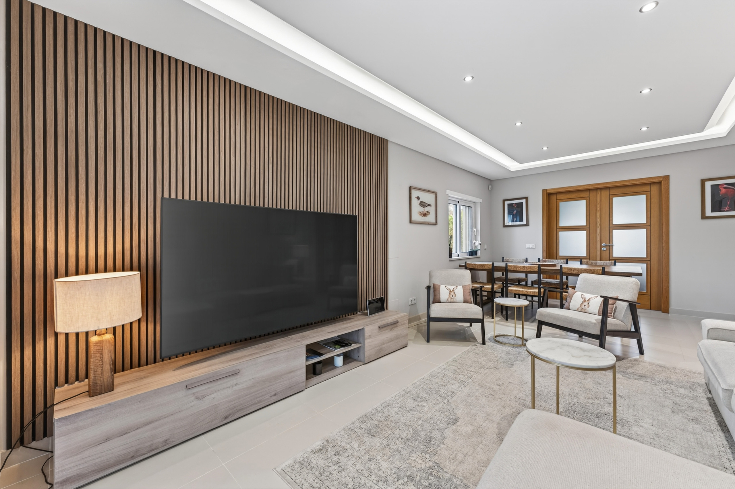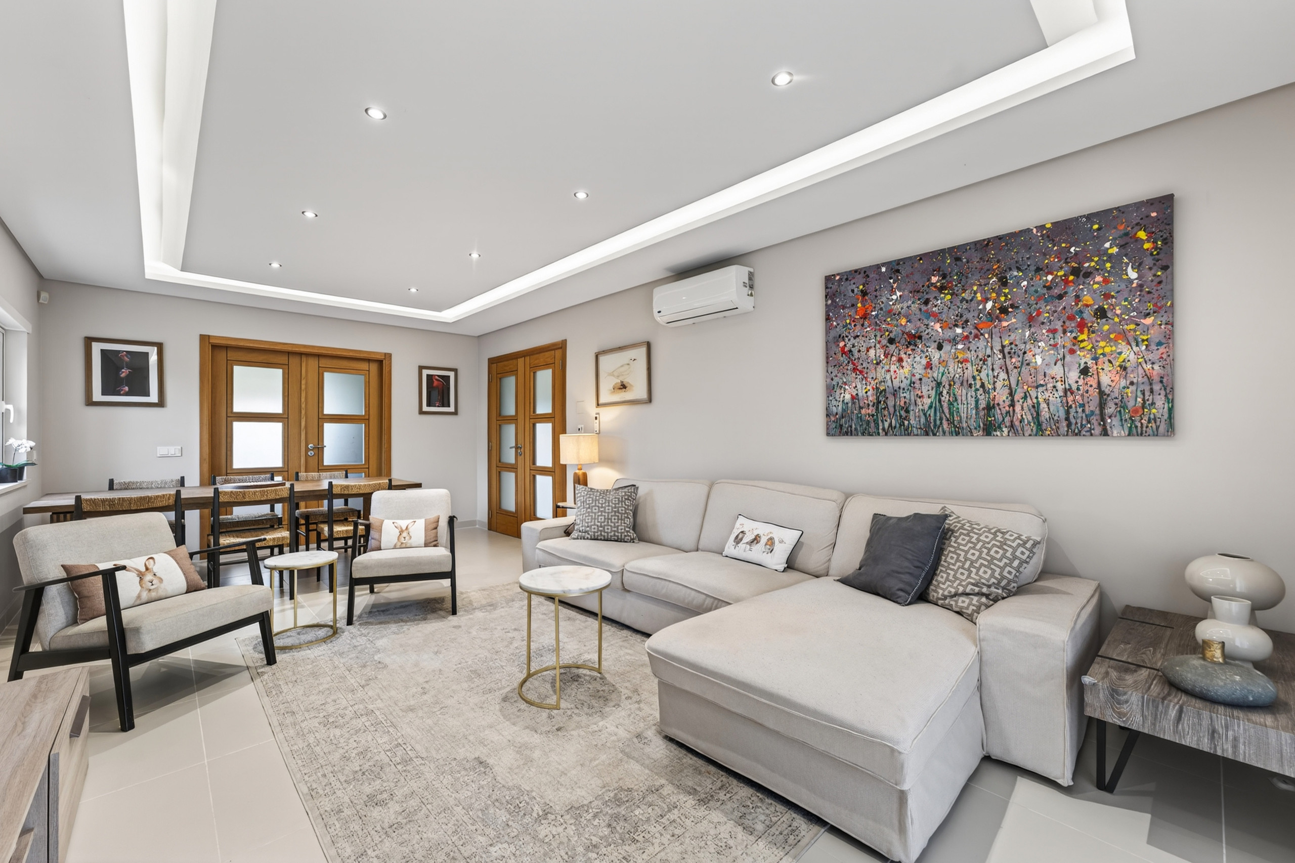 The villa boasts four spacious bedrooms, including three en-suite, and comfortably hosts up to seven guests. Inside, the atmosphere is bright and inviting, featuring an open-plan living and dining area and a fully equipped kitchen, perfect for relaxed meals and effortless entertaining.